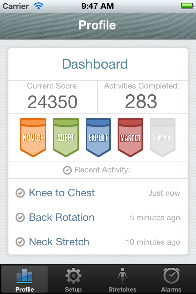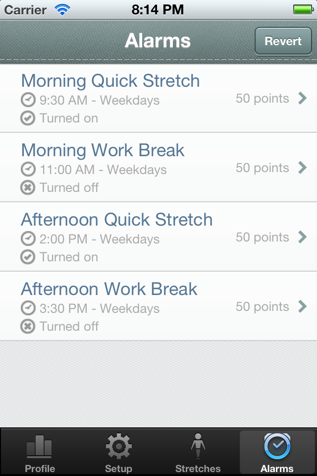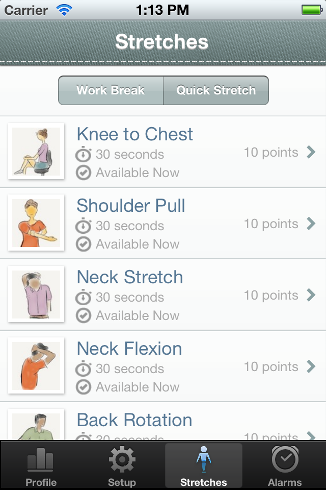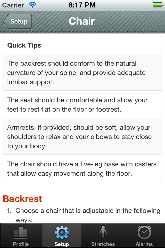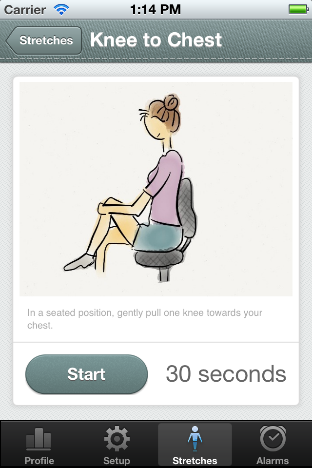 Ergonomics is a complete mobile workplace health solution that offers ergonomic equipment setup advice, a variety of workplace specific stretching exercises, and programmable reminders to help you time your breaks.